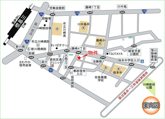 東海道本線「川崎」駅 バス15分 池藤橋 停歩2分 京急本線「京急川崎」駅 バス15分 池藤橋 停歩2分 |